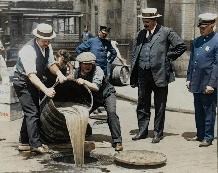 Заместитель комиссара полиции Нью-Йорка Джон А. Лич, справа, наблюдает, как агенты сливают спиртное в канализацию после рейда в разгар сухого закона. США, 1920-е годы.