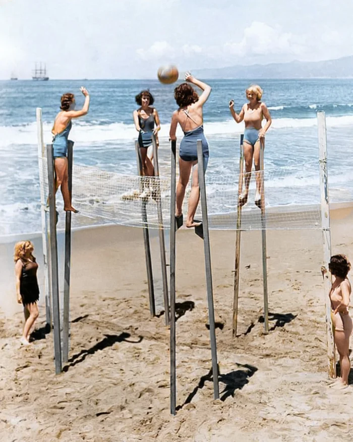 Девушки играют в волейбол на ходулях. Район Венис-Бич, Калифорния, 1942 год.