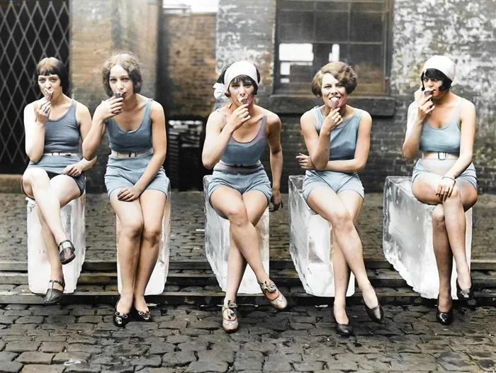 Девушки едят мороженое сидя на глыбах льда, 1926 год.