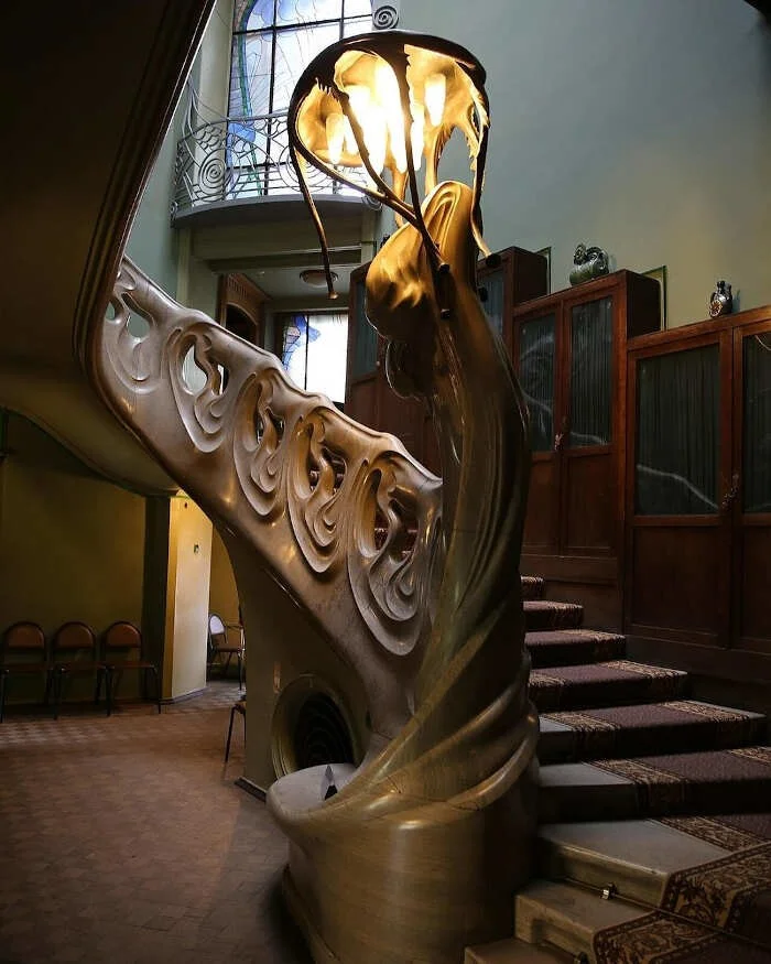 12. Главная лестница дома С.П. Рябушинского (ныне музей-квартира А.М.Горького) Москва. В комплекте с люстрой в форме медузы. Построен в 1900-1902 годах архитектором Федором Шехтелем