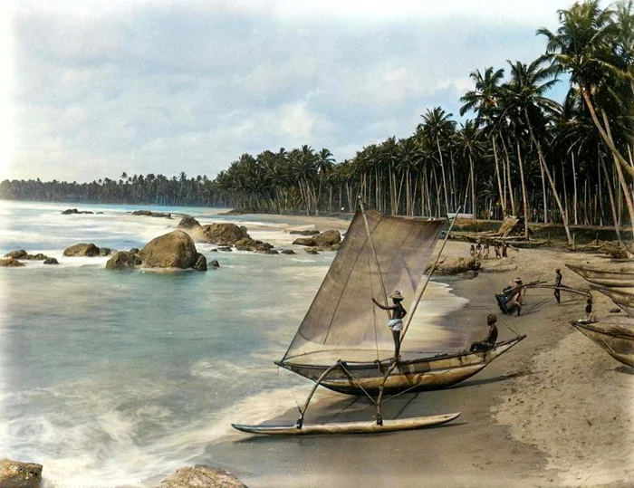 Сингальцы и рыбацкая лодка. Цейлон (Шри-Ланка), около 1880 года.
