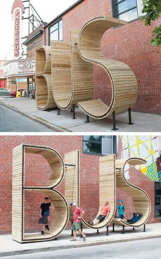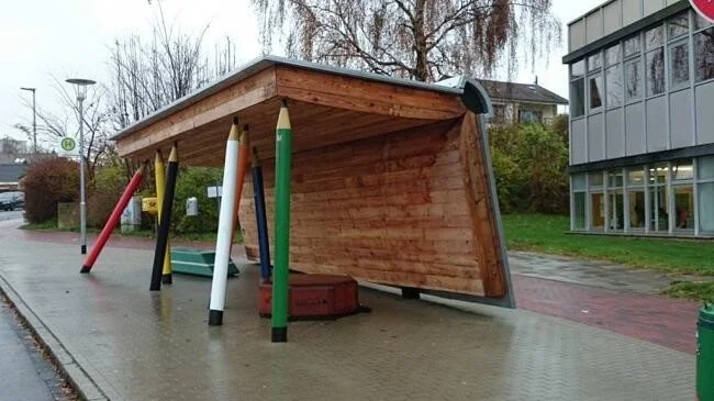 1. Автобусная остановка в виде открытой книги с карандашами.