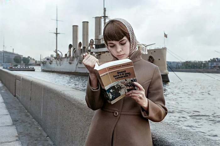 Французская певица Мирей Матье читает роман Жана-Поля Олливье «Когда рассвет, товарищ?» около крейсера "Аврора". Ленинград, 31 мая 1967 года.