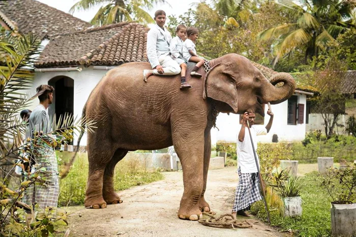 Чиновник из Бибилы с двумя своими сыновьями на слоне перед собственным домом. Цейлон, 1926-1929 год.
