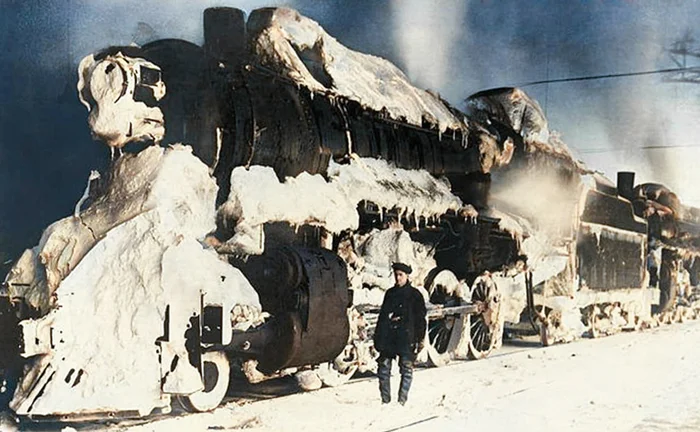 Обледеневший поезд на вокзале после завершения маршрута. Канада, 1918 год.