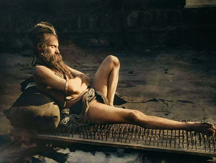 Факир на ложе из гвоздей, Бенарес, Индия 1907 год.