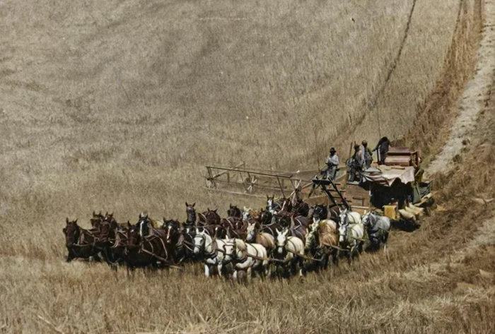 Комбайн, запряженный 33 лошадьми, Уолла-Уолла, около 1902 год.
