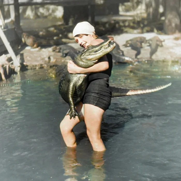 Девушка борется с аллигатором в бассейне на ферме. Лос-Анджелес, Калифорния, 1900 год.