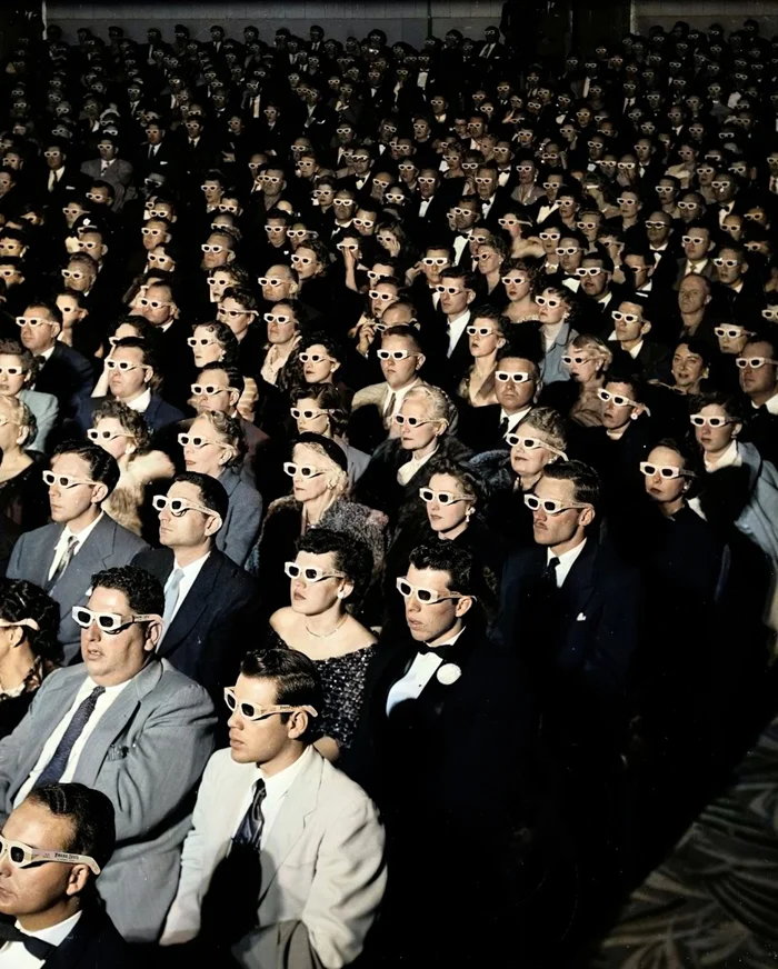 Зрители на просмотре первого полнометражного стерео-фильма Bwana Devil, 1952 год.