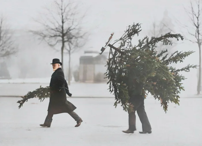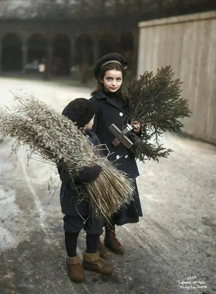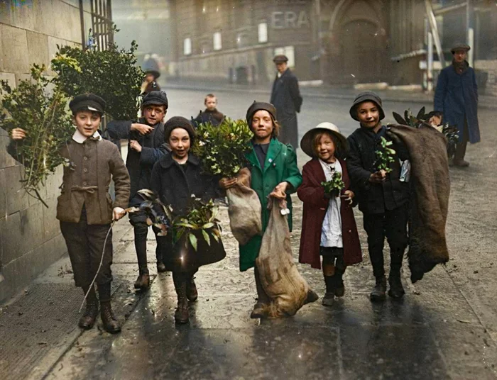 Скандинавские дети несут домой традиционный рождественский декор и елку, 1905 год.