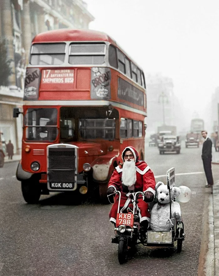 Санта Клаус едет на мотоцикле с коляской по Оксфорд-стрит в Лондоне, Англия. 17 декабря 1949 года.
