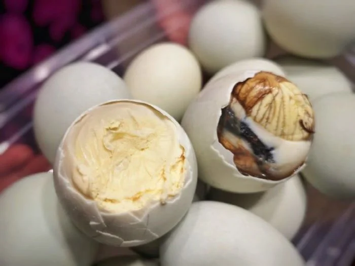 Так, кстати, появилось одно из самых известных китайских блюд – «Столетнее яйцо». Куриные или утиные яйца не варили, а обмазывали смесью из гашеной извести, глины, золы и соли. Затем их укладывали в корзины и закапывали в землю на пару месяцев.