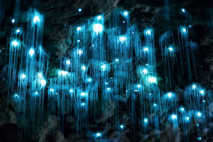 Зачем создателям "Аватара" было что-то придумывать, если всё это есть у нас на Земле. Светящиеся пещеры Вайтомо – одна из жемчужин нашей планеты. Живописные подземные залы полюбились грибным комарикам Arachnocampa luminosa, личинки и самки которых светятся в темноте. А свисающие с потолка нити – их ловчий инструмент, так как эти комарики хищные. Мелкие мошки летят на свет, и попадают в липкую ловушку.