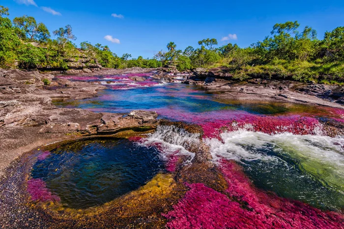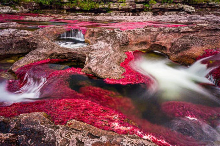 Эту реку называют по-разному: река богов, радужная река, волшебная река и т.п. Несмотря на её потрясающий вид открыта она была относительно недавно, в прошлом веке местным краеведом. Чёрный цвет ей придают колодцы, белый – пенящиеся водопады, синий – отражение неба; зелёный, жёлтый и красный – водная растительность. Красное растение называется Macarenia clavigera, оно краснее в маловодный период, когда много солнца, а вода не мешает солнечным лучам пробиваться к листьям.