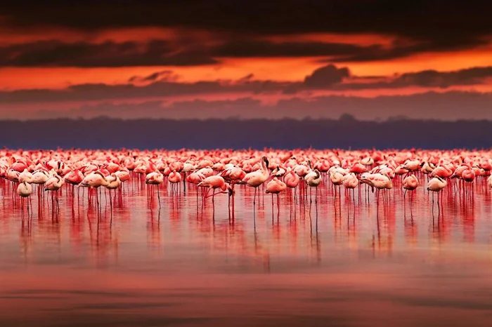 Щелочное озеро Натрон, одно из многих в Великой Рифтовой долине. Несмотря на едкий состав воды (а слово "натр" означает "щёлочь", от него произошло название элемента "натрий), озеро обитаемо. Красный цвет ему придают цианобактерии, которые питаются при помощи фотосинтеза, а красный пигмент является в этом процессе вспомогательным.