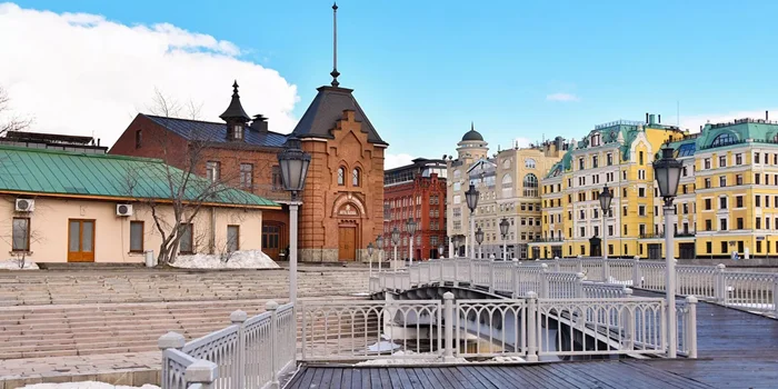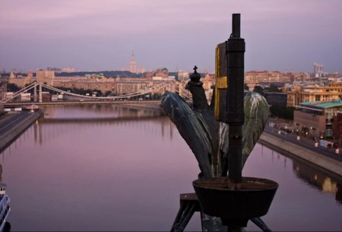 Памятник высится на искусственном острове, который находится у разделения Москвы-реки и Водоотводного канала. Чтобы попасть на него, нам потребуется пройти металлический мостик.