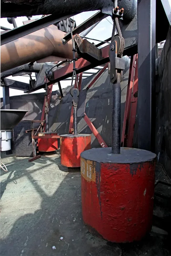 Весь памятник держится на восьми мощных опорах, которые уходят на 5 метров под землю. Хотя конкретно эта фиговина слева не опора, а водосточная труба. По ней вся талая вода с палубы стекает вниз.