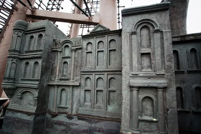 Чтобы подойти к входу, надо вплотную приблизиться к фигуре памятника. Перемахиваем по приставной лестнице с дощатого пола на каменный постамент по приставной лестнице.