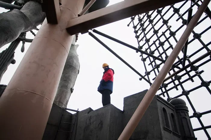 На этом мутном скрине при большом желании можно разглядеть сварщика за работой. Находится этот счастливчик внутри статуи.