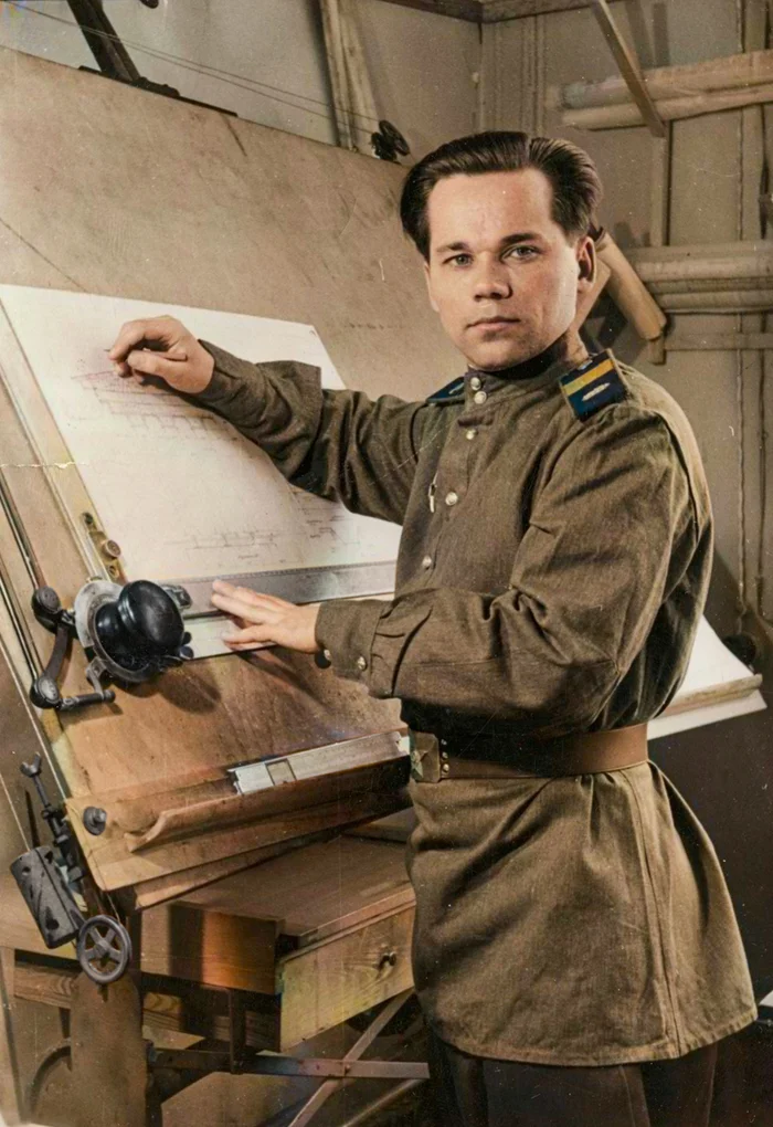 Старший сержант Михаил Калашников в период работы на полигоне НИПСМВО, 1944 год.