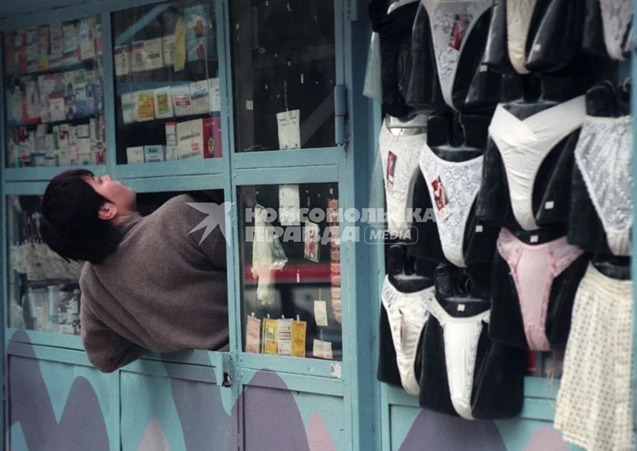 Продавщица аптечного ларька выглядывает из окна на витрину. Сочи, 1990-е годы.