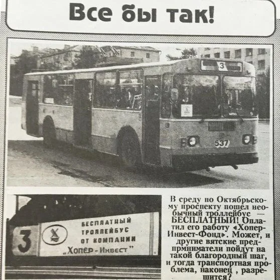 В 1994 году по Кирову ходил бесплатный троллейбус от известной финансовой пирамиды "Хопер инвест".