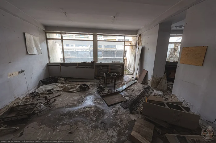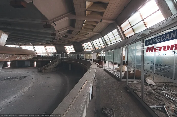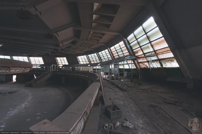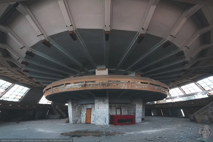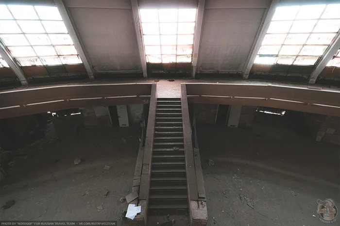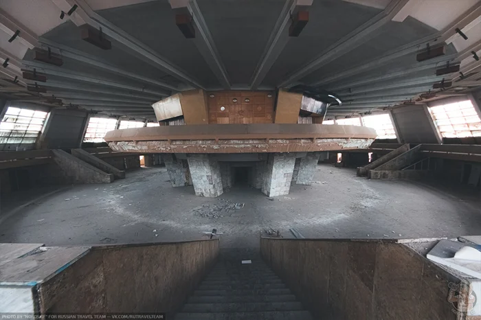 А теперь заглянем внутрь величественного здания — смелая геометрия прослеживается и внутри, но общее состояние заброшенного сооружения столь же плачевное внутри, как и снаружи.