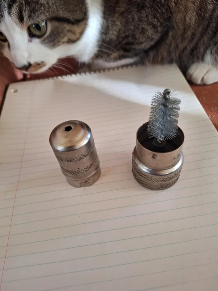 Это кошка. А на столе чистилка для клемм аккумулятора.