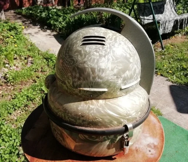 А это фен с шапочкой-сушуаром, который надевался на голову, чтобы побыстрее просушить, например, накрученные на бигуди волосы. Он обычно еще был с ремешком, чтобы можно было с ним ходить по квартире и делать какие-то дела, а не сидеть и ждать, пока волосы высохнут.