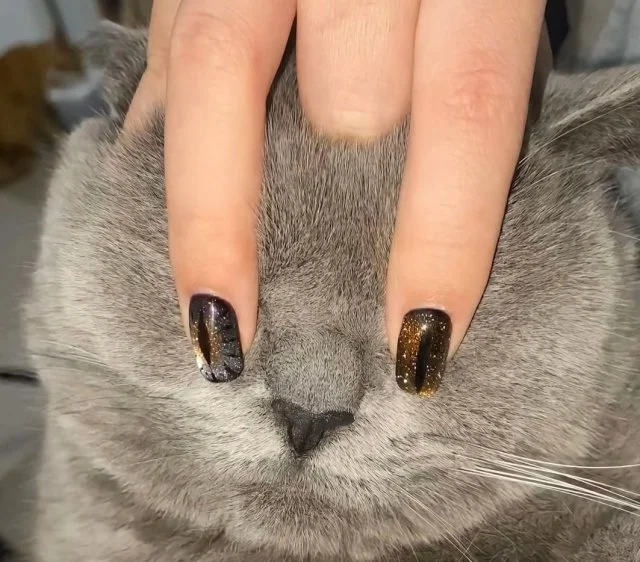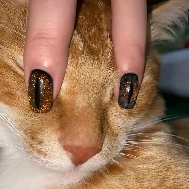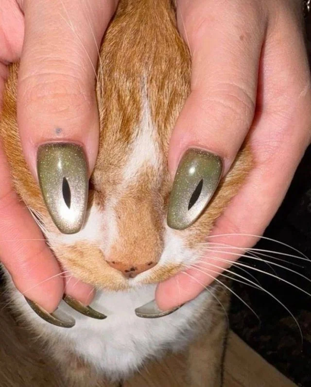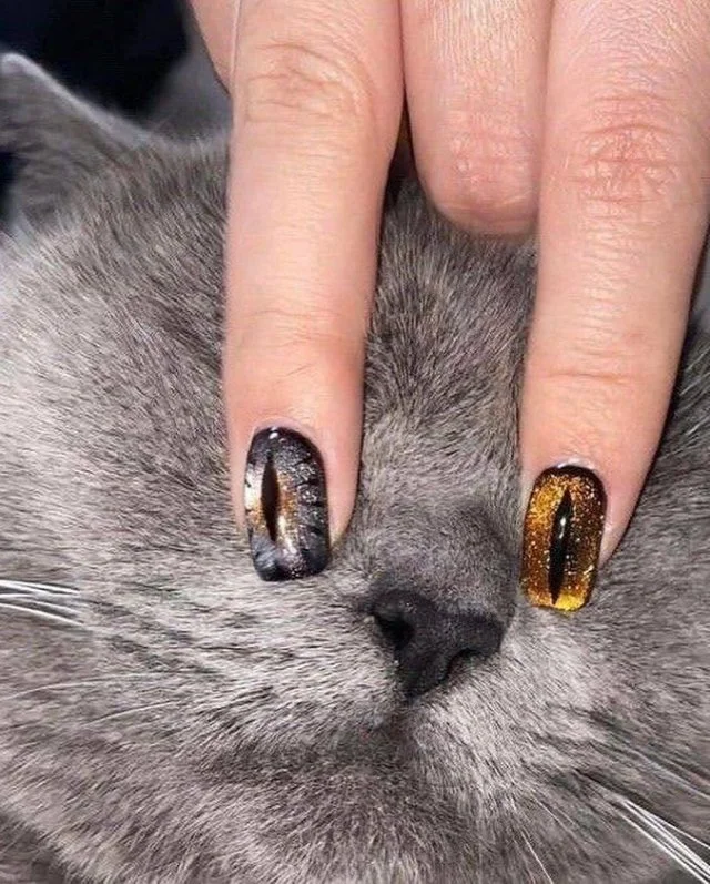 Как можно объединить любовь к котикам и красивым ноготочкам? Правильно, сделать маникюр с "кошачьими" глазками. Девочки, запоминайте идею! Выглядит действительно очень прикольно.