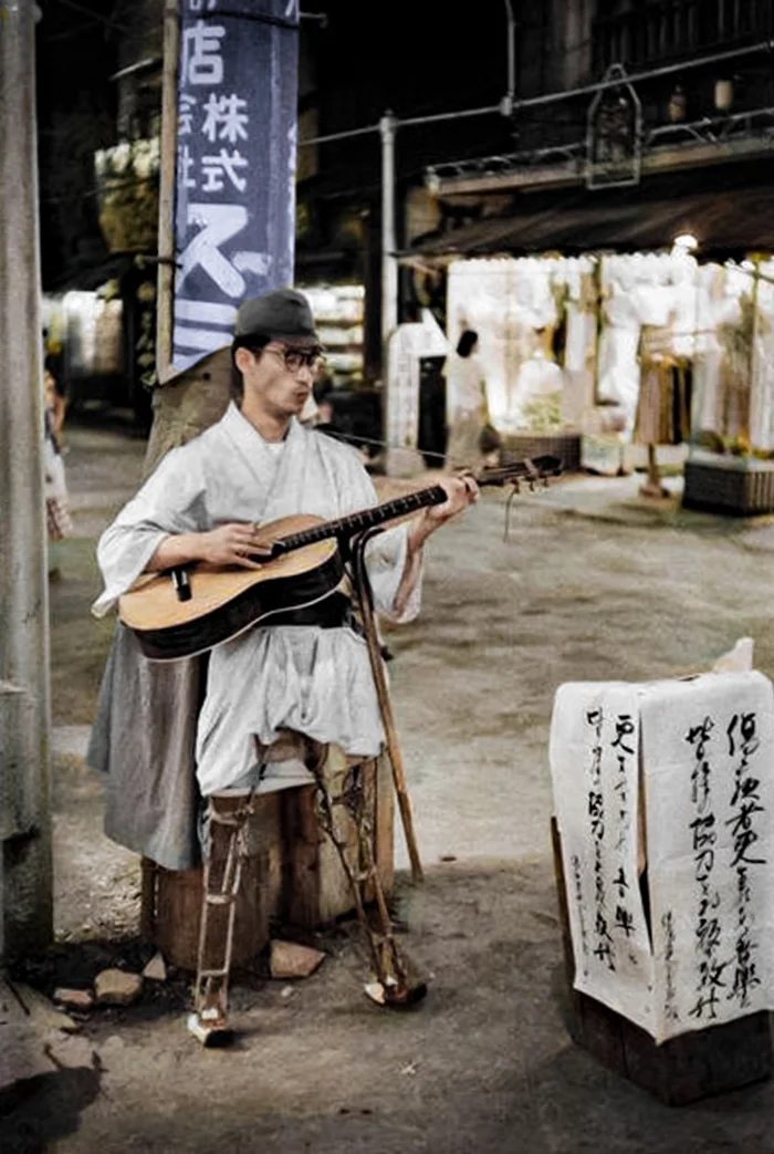 Ветеран Второй Мировой зарабатывает себе на жизнь игрой на гитаре. Токио, 1951 год.