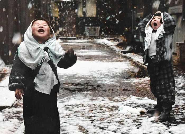 Японские дети искренне paдyются выпавшему снегу, 1950-е.