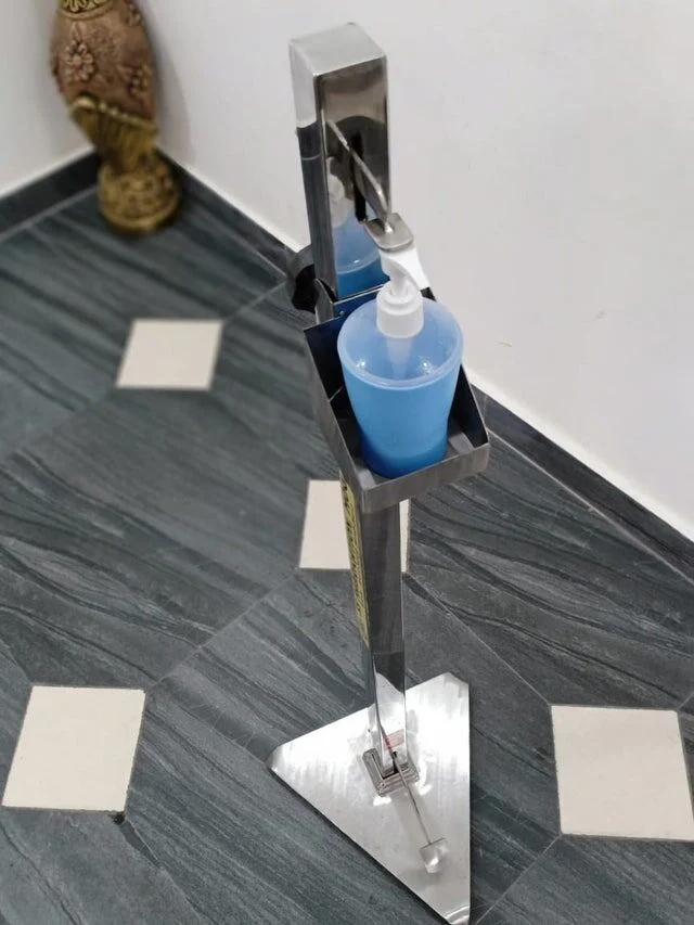 14. Стойка с санитайзером, который выдавливается нажатием на педаль