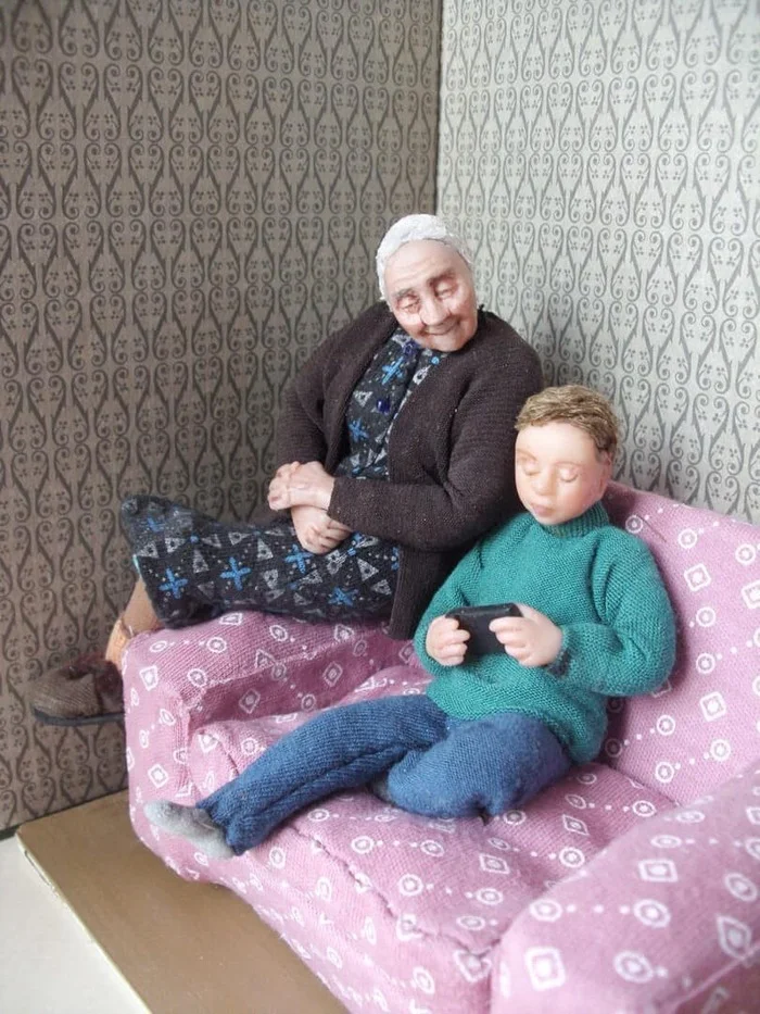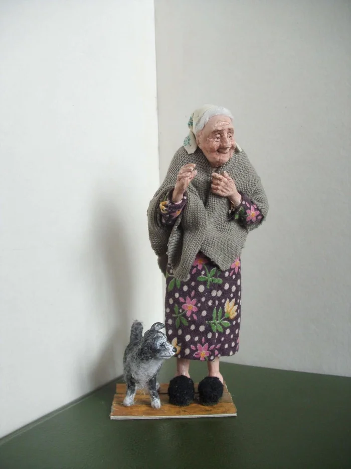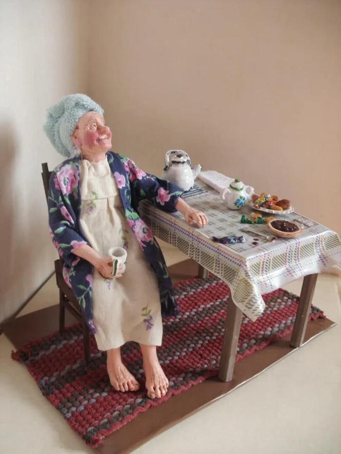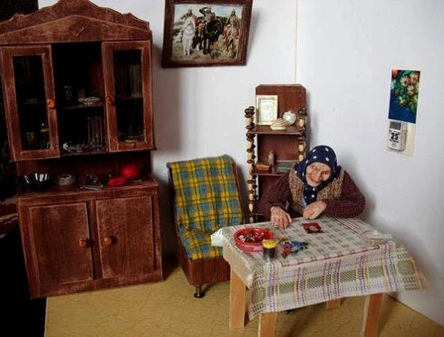 Не меньше месяца мастер тратит на создание одной композиции: сначала из полимерной глины делает лицо и руки, затем самая трудоёмкая часть – подбор одежды и интерьера. Туловище всех кукол сделано полностью из ткани. Внутри даже нет проволочного каркаса. Они могут стоять самостоятельно и держать при этом равновесие.