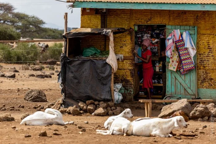 Продуктовый магазин в Кении обычно представляет собой деревянный стол, на котором лежит что-то съестное.