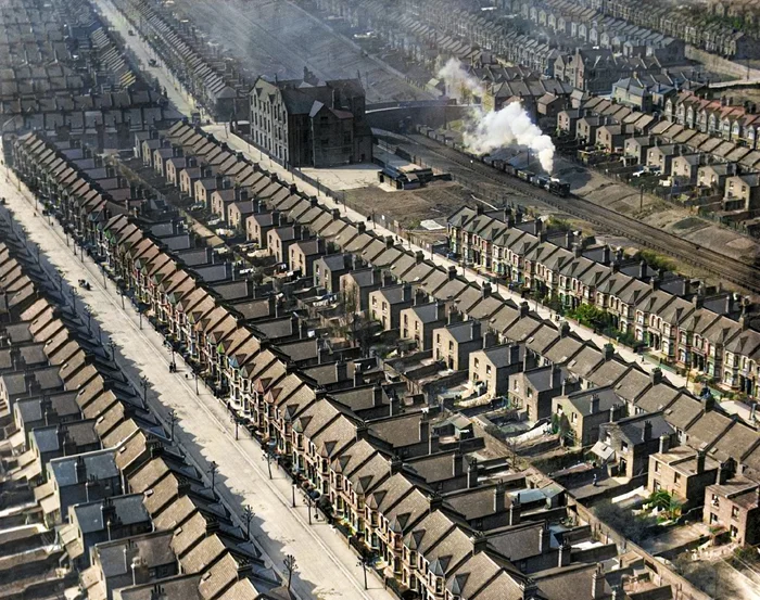 Поезд проходит через густонаселенные кварталы вдоль Кенсал-Райз, Лондон, 1921 год.