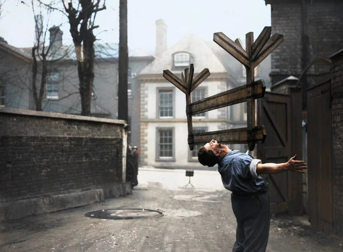 Джо Смит, кузнец-силач из Глостера, держит в зубах ограду для дорожных работ. Англия, 1936 год.