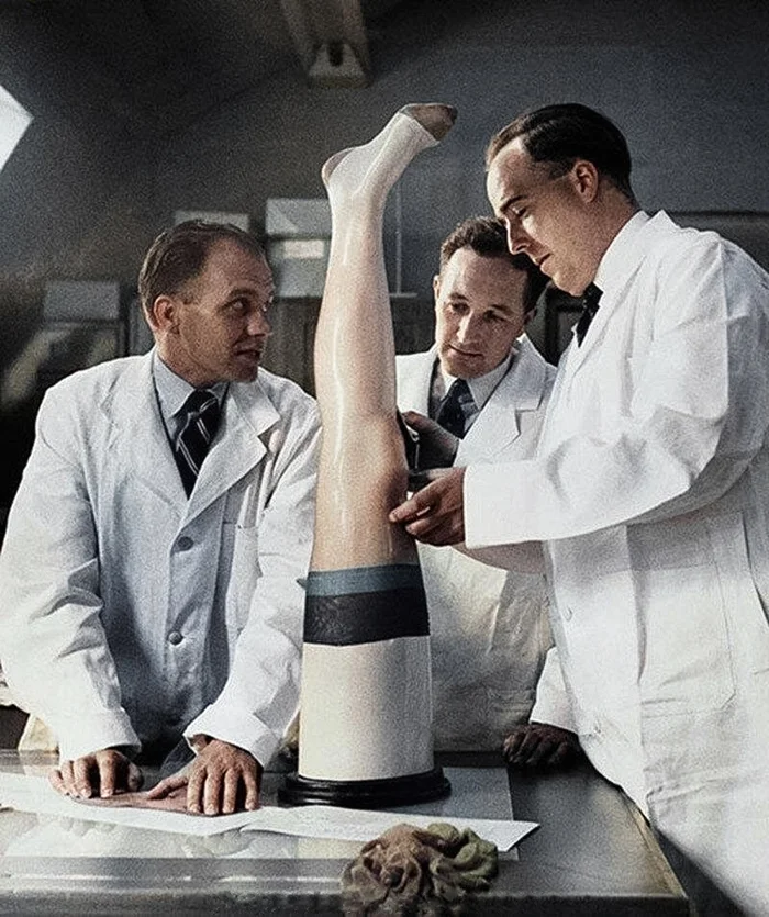 Нейлоновые чулки проходят строгие испытания в текстильной лаборатории Mark's and Spencer's, 1955 год.