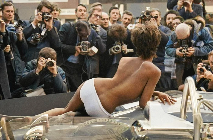 Фотографы вокруг гоночного автомобиля в конференц-холле Олимпия, Великобритания, 1971 год.