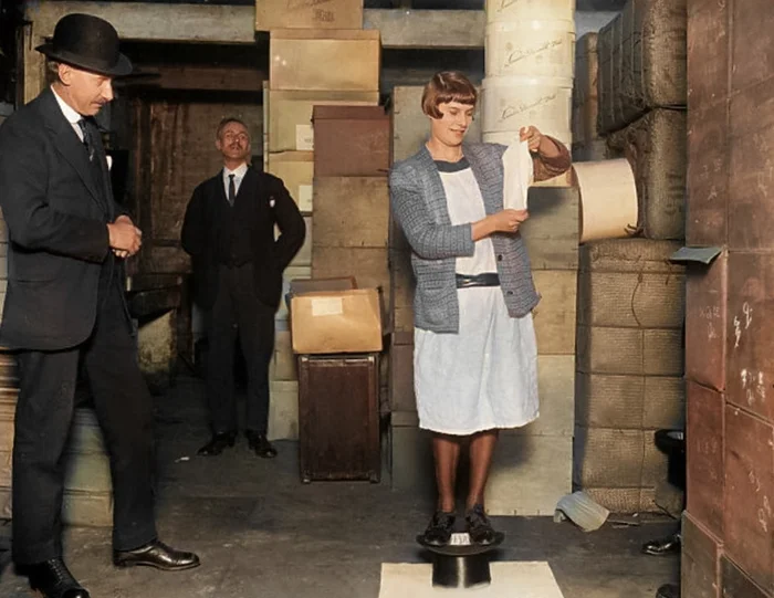 Помощница шляпника стоит на полях цилиндра, чтобы показать его прочность. Лондон, 1925 год.