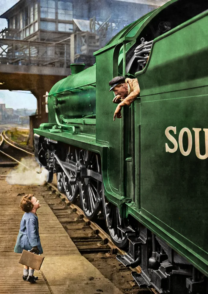 Маленький мальчик с крохотным чемоданчиком разговаривает с машинистом большого локомотива Southern Railway, перед его отъездом в Брайтон. Лондон, 1924 год.