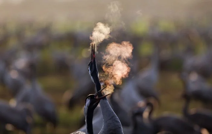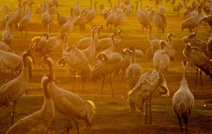 Журавли слетаются в заповедную зону озера Хула в сезон миграции, Израиль