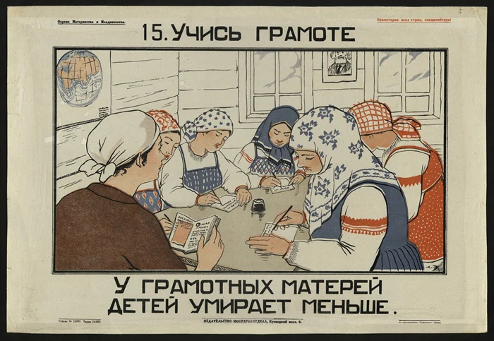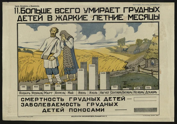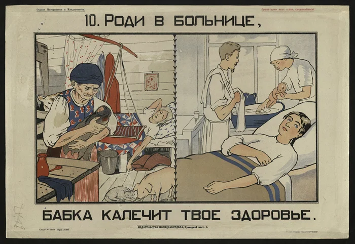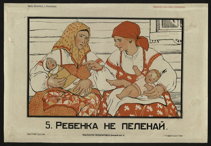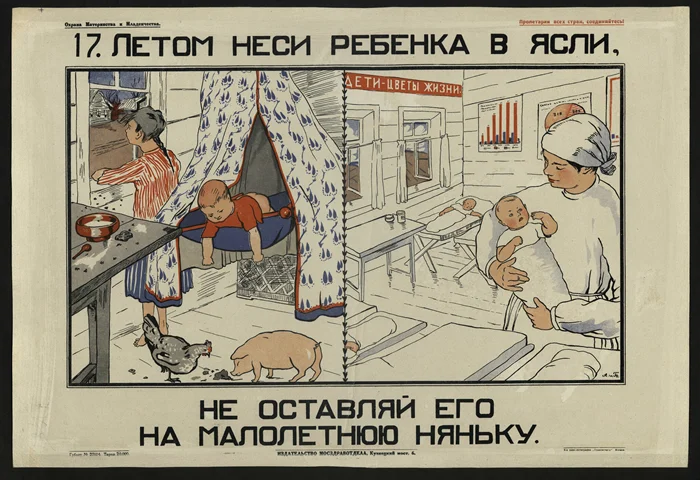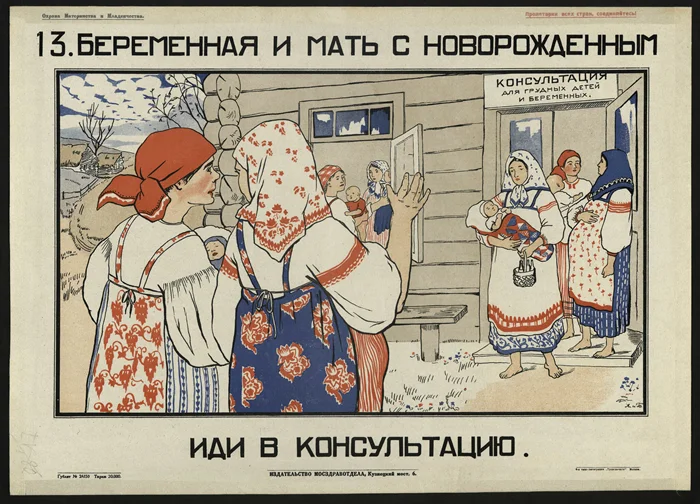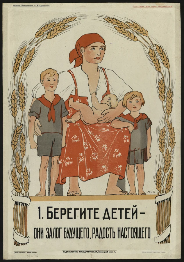 Агитация во имя заботы: серия плакатов 1925 года «Охрана материнства и младенчества» – как советская пропаганда подчеркивала важность здоровья матерей и детей.