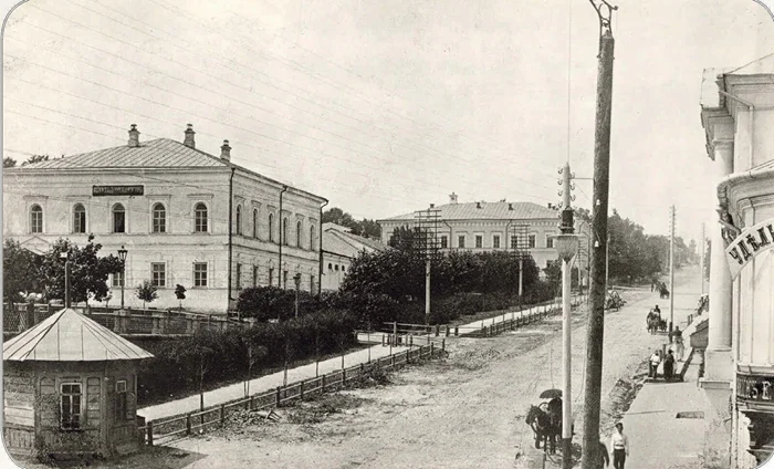 Гимназия в то время находилась в сквере рядом с гауптвахтой и губернаторским домом. Это было одноэтажное деревянное строение с двумя подъездами по концам. Один из подъездов назывался учительским, а другой гимназическим. Весь этот дом разделялся коридором на две половины, в которых и помещались класс ы, а в конце коридора - физический кабинет, учительская комната и небольшая комната с медным бассейном на манер громадного самовара с несколькими кранами, из которого мы и пили в оду. Библиотеки у нас никакой не было, а равно не было и так называемой «уборной», ибо уборная эта, со стоявшая из небольшого тесового сарайчика, находилась вне здания гимназии, позади конюшни». (прим. бассейнами в то время называли места для забора воды, обычно в виде фонтанов, будок или просто больших баков)