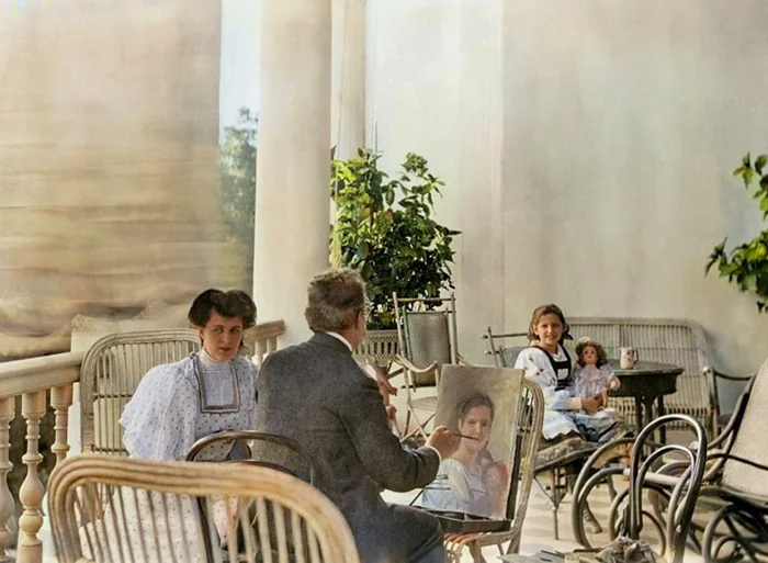 Ольга Морозова позирует художнику Николаю Ивановичу Чечелеву на террасе в усадьбе Одинцово-Архангельское, 1900-е годы.