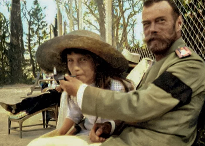 Царь Николай II балует папироской из своих рук Княжну Анастасию. 1916 год.