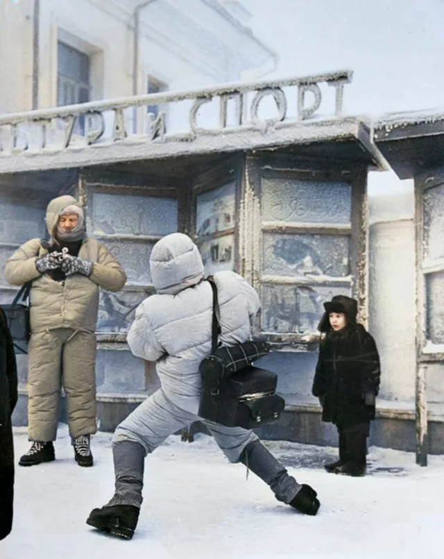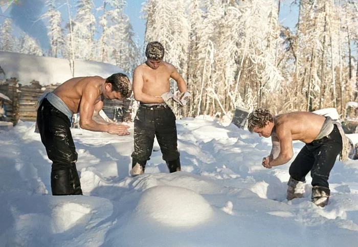 Молодые люди умываются снегом в 60-градусный мороз на полюсе холода в Оймяконе. Республика Саха (Якутия), 1970 год.