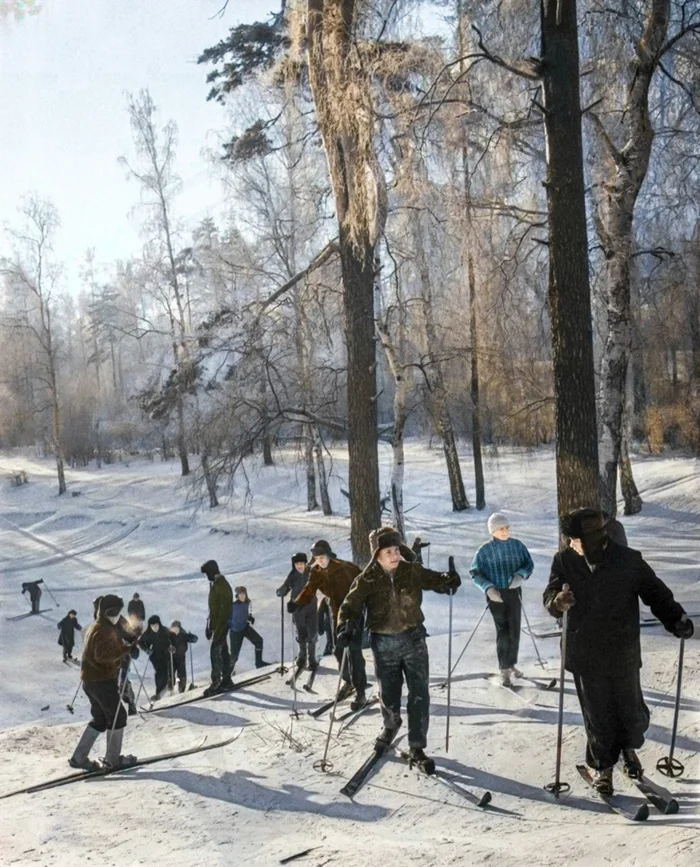 На лыжной прогулке в Измайловском парке культуры и отдыха. Москва, 1 января 1962 года.