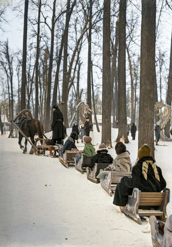 Санный поезд в детском городке Измайловского парка культуры и отдыха. Москва, 1964 год.
