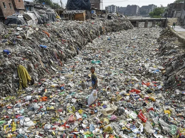 Мальчик собирает предметы, пригодные для вторичной переработки, из полусухой канализации в Таймур нагар в Нью-Дели
